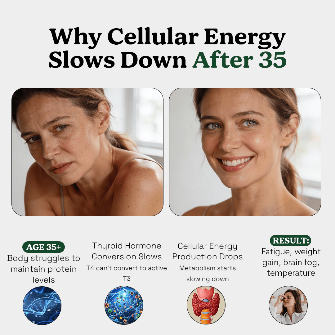 By addressing protein deficiency at the cellular level, it supports optimal thyroid function, restores natural energy metabolism, and helps your body regulate temperature, weight, mood, and cognitive function naturally.