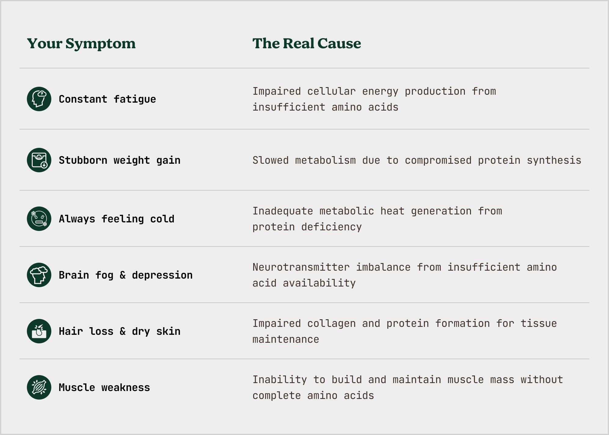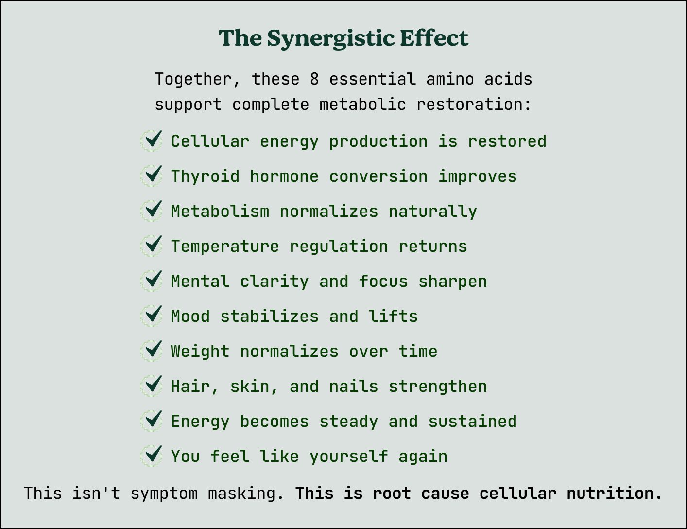Medication provides hormones, but if your cells lack the amino acid building blocks to utilize those hormones effectively, the underlying metabolic dysfunction continues. You're adding fuel to an engine that's missing critical parts.