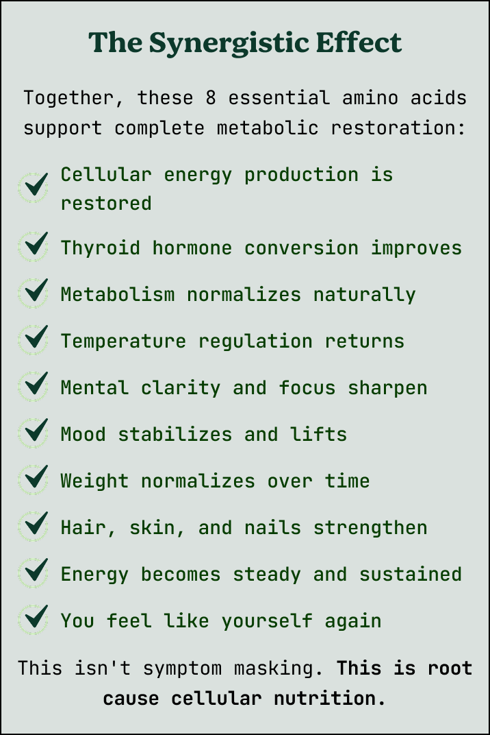 What makes this formula unique is comprehensive essential amino acid provision. Most supplements are incomplete or provide inadequate amounts. This delivers all 8 essential amino acids in therapeutic quantities—exactly what's needed for cellular energy production, thyroid hormone conversion, neurotransmitter synthesis, and metabolic restoration. When cells have the building blocks they need, the body can utilize thyroid hormones effectively."